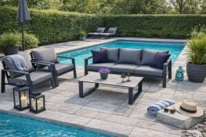 Loungesæt 5 pers. Antracit alu stel Ink. vandafvisende HynderSofasættet består af 3 pers sofa og to loungestole og bord med non wood bordplade.